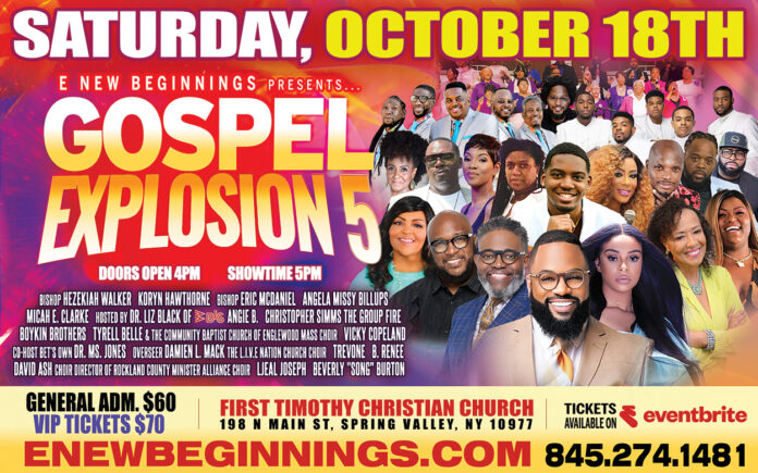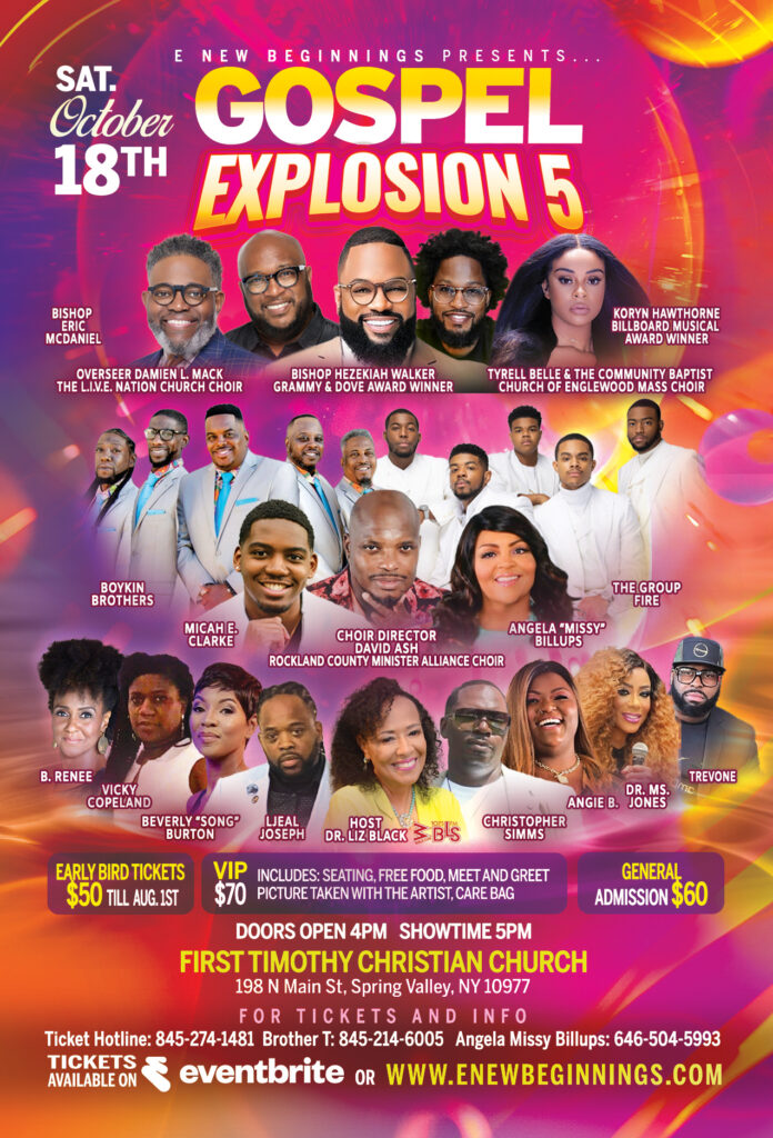 Spring Valley, NY โ€” Saturday, October 18th, 2025 โ€” The spirit of revival and celebration is about to erupt in Rockland County as E New Beginnings proudly presents Gospel Explosion 5, a dynamic night of worship, praise, and community unity. Hosted at First Timothy Christian Church (198 N Main St, Spring Valley, NY 10977), this highly anticipated event is already making waves across the region.