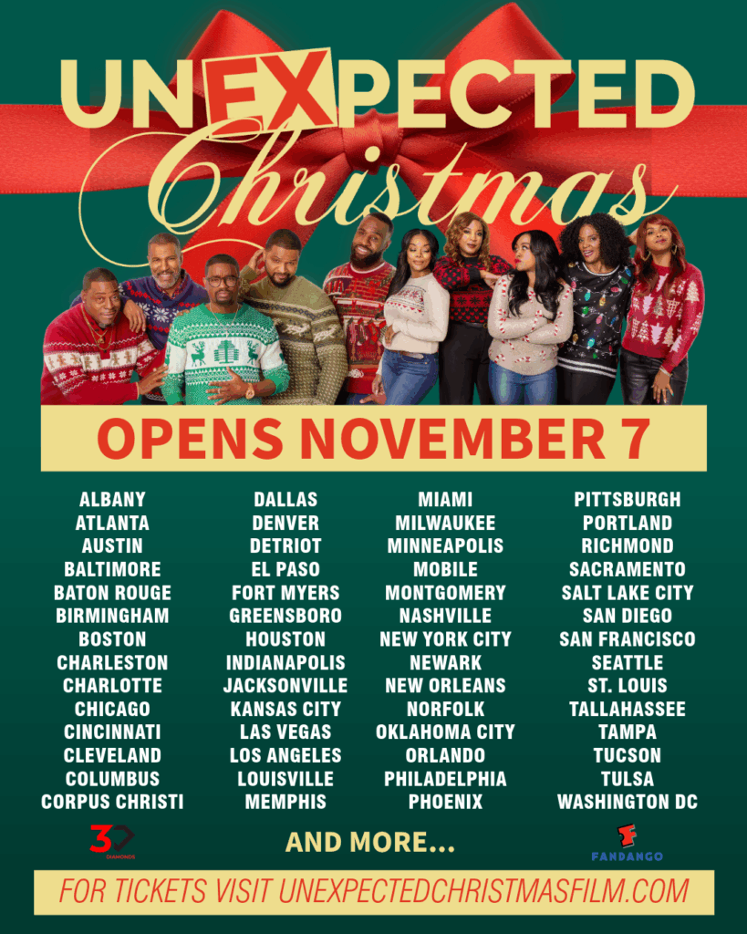 3 Diamonds Films is set to release Unexpected Christmas, in theaters nationwide on November 7. When the Scott family gathers for Christmas, the dream reunion Momma Scott (Anna Maria Horsford) planned quickly turns upside down. Her daughter Marissa (DomiNque Perry) returns home fresh off a breakup with her boyfriend Richard (Lil Rel Howery) and is then shocked when Richard arrives arm in arm with her estranged stepsister Kerry (Reagan Gomez-Preston). Marissa tries to play it cool and invites a surprise guest of her own who has everyone talking, all while Kerry is cooking up a scheme that could ruin the whole celebration. Add in a few romantic mix-ups, old rivalries, and plenty of family secrets, and everyone is in for an unforgettable holiday. With love, laughter, and a little bit of chaos around every corner, this Christmas might just bring the Scotts closer together—or blow the roof off the house!
